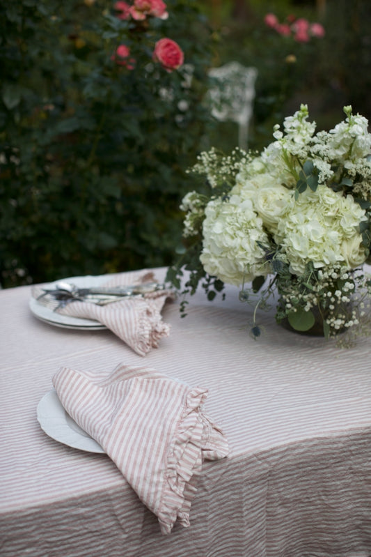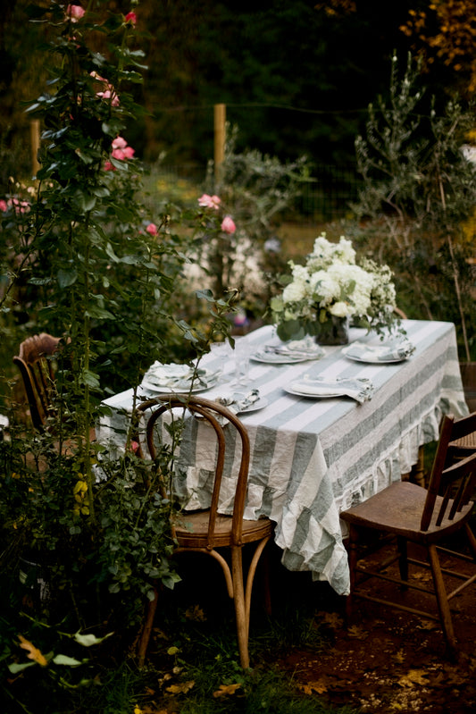 Vintage Blossom Ticking Stripe Linen Ruffled Tablecloth