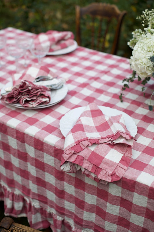 Vintage French Raspberry Check Ruffled Linen Tablecloth