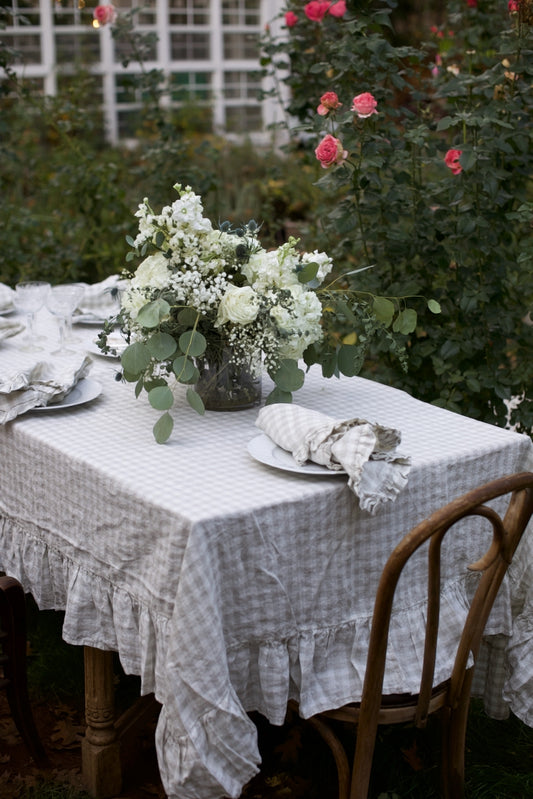 Vintage Dove Gingham Ruffled Linen Tablecloth