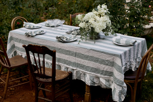 Vintage Sage Stripe Flax Linen Ruffled Tablecloth